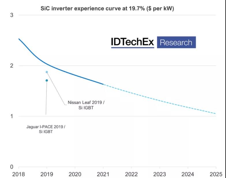 據(jù)IDTechEx數(shù)據(jù),對(duì)比2018年Model 3逆變器和2020年Model Y第二代逆變器的估算成本,短短三年內(nèi),特拉斯的SiC逆變器成本大幅下降,其成本幾乎與2019款日產(chǎn)聆風(fēng)和捷豹I-PACE 的硅基IGBT模塊相當(dāng)。