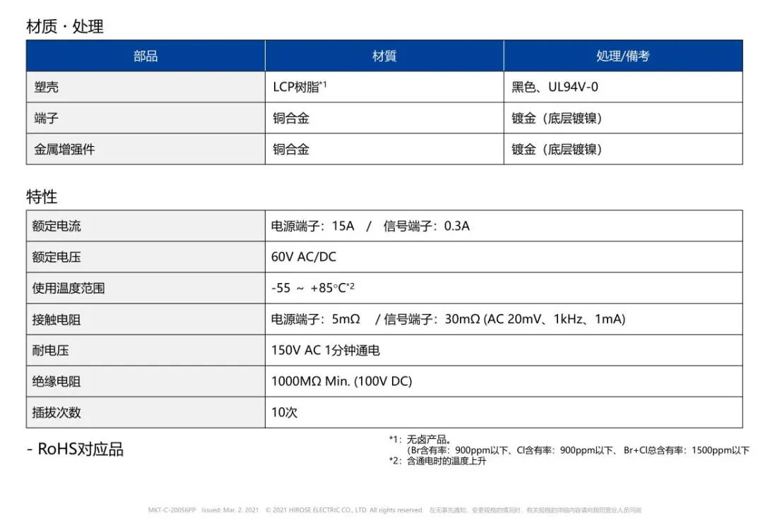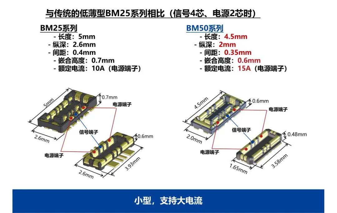 特點(diǎn) 1 兼顧供電能力和小型化的設(shè)計(jì) - 額定電流:支持電源端子15A、信號(hào)端子0.3A - 嵌合高度:0.6mm、縱深:2.0mm 2 通過全包覆構(gòu)造,確保高牢固性 3 使接觸電阻最小化,節(jié)省電力 4 實(shí)現(xiàn)小型,高抜出力 5 互相夾緊型多觸點(diǎn)構(gòu)造,確保高接觸可靠性 有助于小型化&大電流化