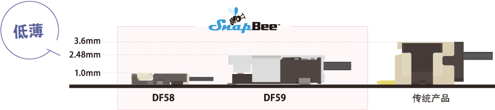 支持28 AWG,高度1.0mm,是業(yè)內(nèi)最低薄級(jí)別的小型連接器。DF58系列是SnapBee中在低薄構(gòu)造和窄間距方面最具優(yōu)勢(shì)的產(chǎn)品,有助于實(shí)現(xiàn)機(jī)器設(shè)備的小型化。較大的有效嵌合長(zhǎng)度可以實(shí)現(xiàn)穩(wěn)定的連接。