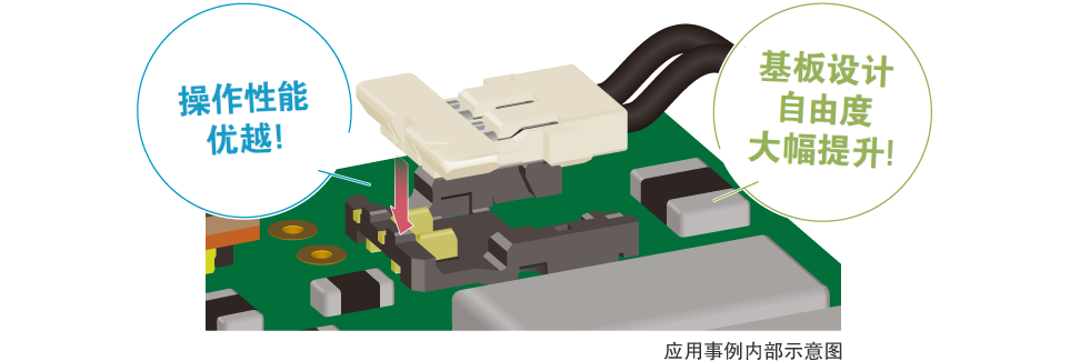 垂直嵌合不影響其他元器件,有效節(jié)省空間,提高基板設(shè)計(jì)自由度。采用從上向下的嵌合方式,易于確認(rèn)嵌合口,從而更好地確定插